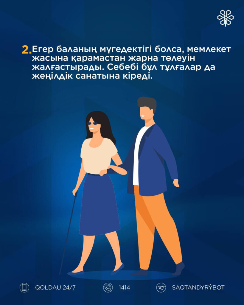 - Егер баланың мүгедектігі болса, мемлекет жасына қарамастан жарна төлеуін жалғастырады. Себебі бұл тұлғалар да жеңілдік санатына кіреді.