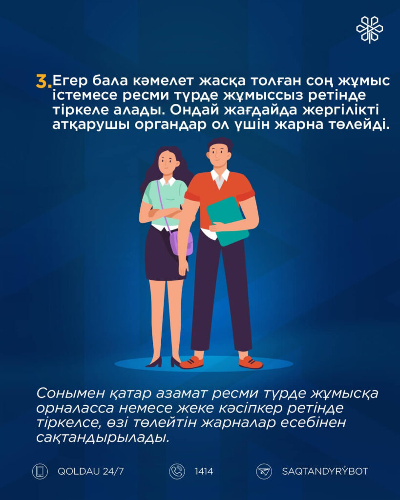 - Егер бала кәмелет жасқа толған соң жұмыс істемесе ресми түрде жұмыссыз ретінде тіркеле алады. Ондай жағдайда жергілікті атқарушы органдар ол үшін жарна төлейді.