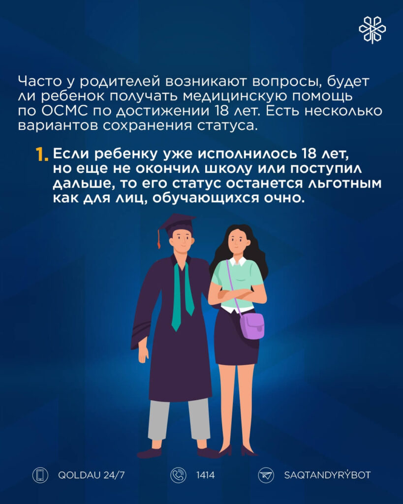 Часто у родителей возникают вопросы, будет ли ребенок получать медицинскую помощь по ОСМС по достижении 18 лет. Есть несколько вариантов сохранения статуса.