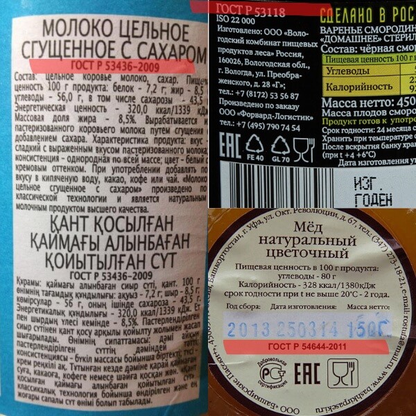 Этикетка должна содержать название, состав и пищевая ценность продукта, срок годности, производитель.